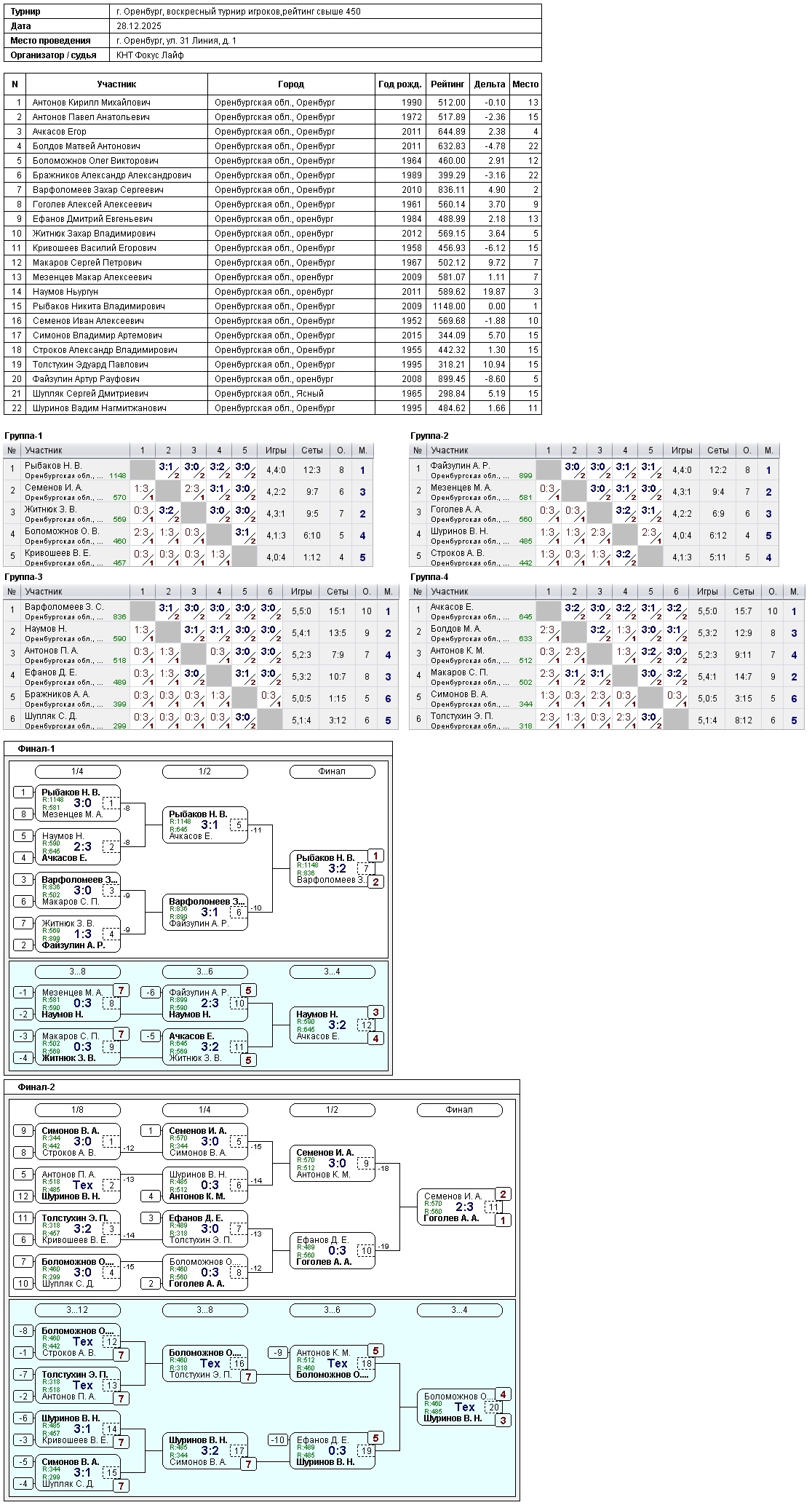 В турнире игроков, рейтинг свыше 450, приняли участие – 22 спортсмена.