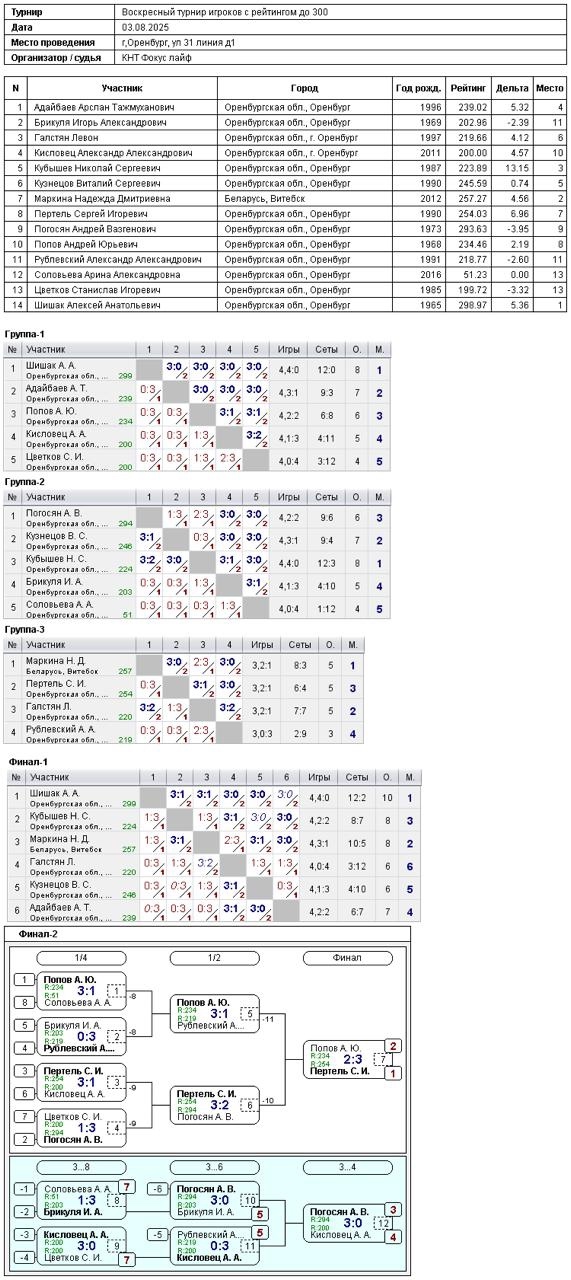 В турнире игроков, рейтинг до 300, приняли участие 14 спортсменов.