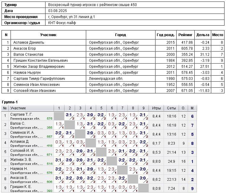 В турнире игроков, рейтинг свыше 450, приняли участие – 9 спортсменов. Победителями
