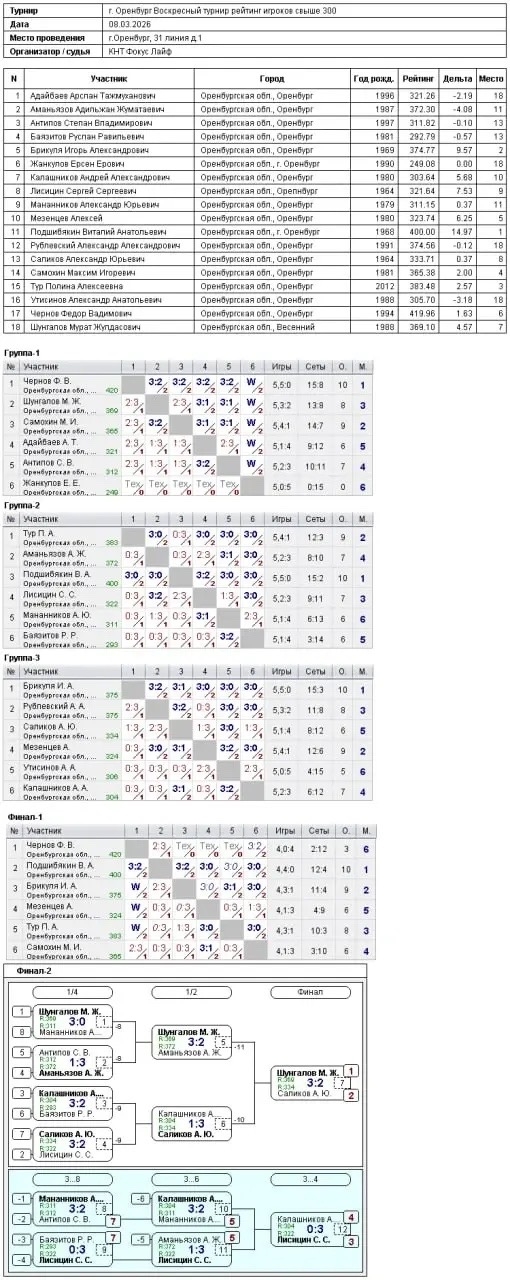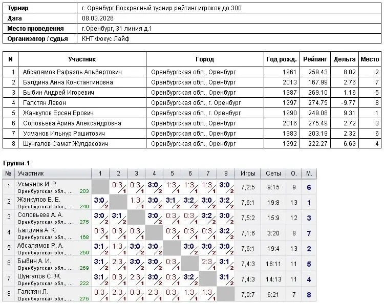 Сегодня в турнире игроков, рейтинг до 300, приняли участие 8 спортсменов.