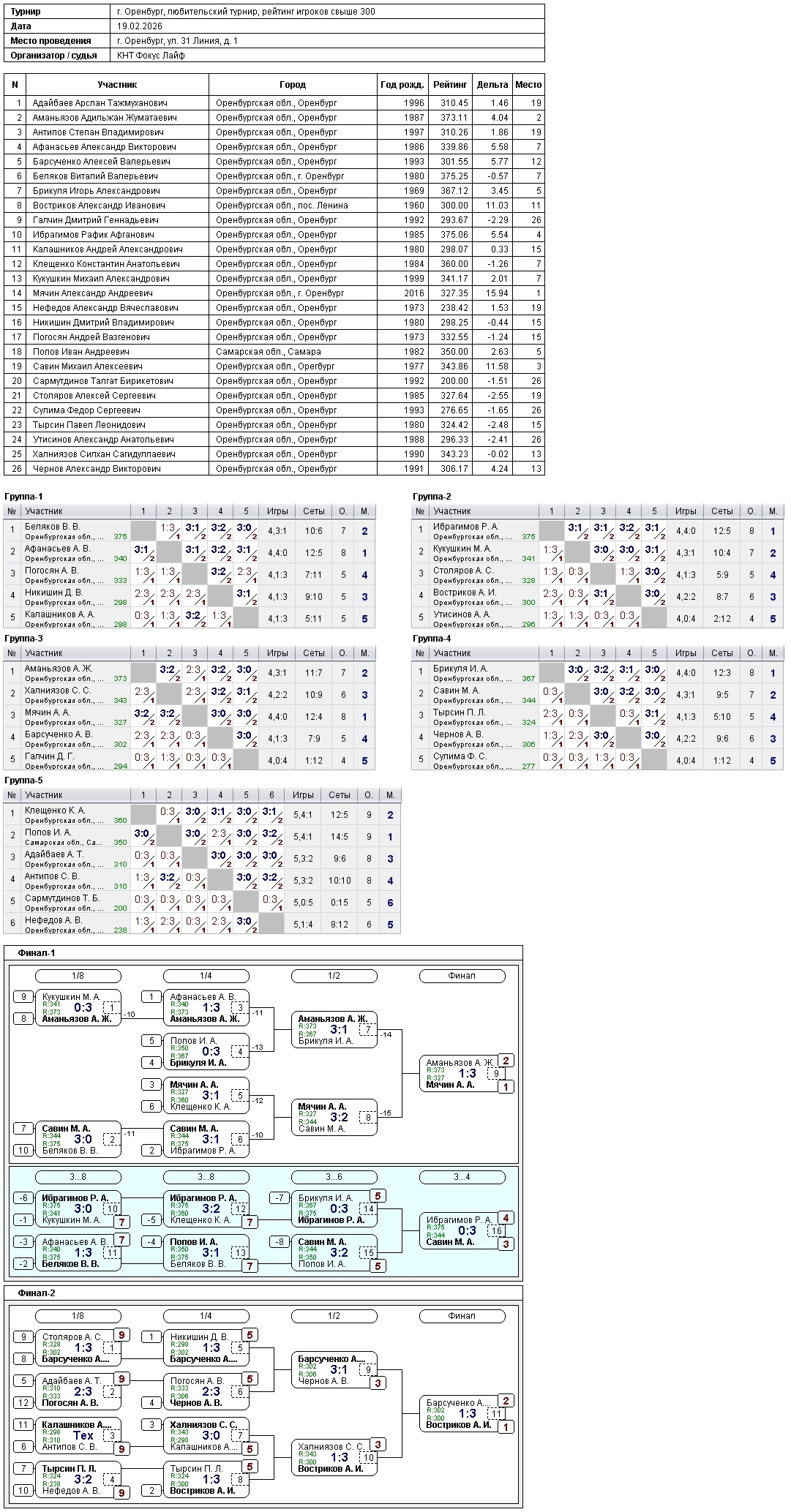 Внутренний турнир «Фокус Лайф» 19.02.2026