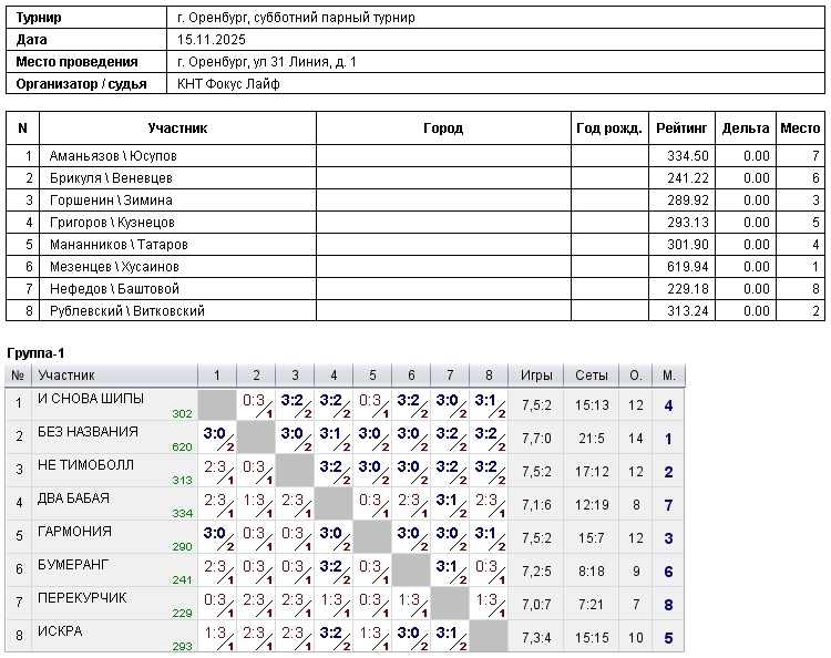 В связи с турнирами по настольному теннису в Оренбургской области и г. Кстово многие участники не смогли присутствовать на парном турнире сегодня в КНТ Фокус Лайф. Для оптимизации игрового процесса мы приняли решение объединить 2 субботних парных турнира в 1.