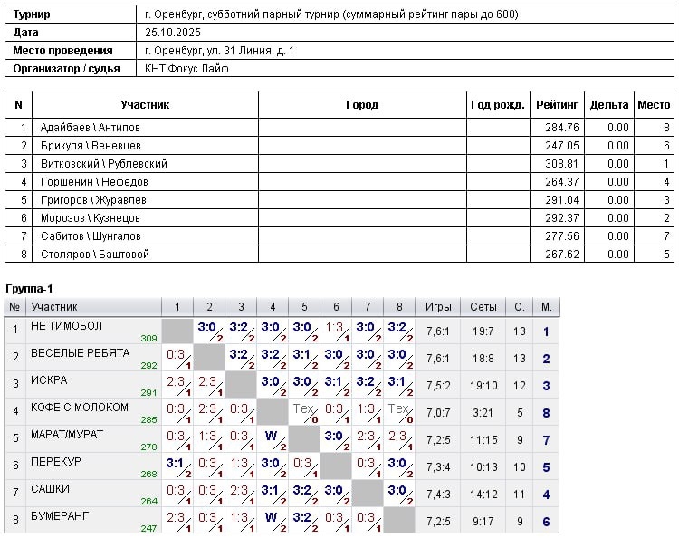 В турнире игроков, суммарный рейтинг пары не выше 600 , приняли участие 8 команд :