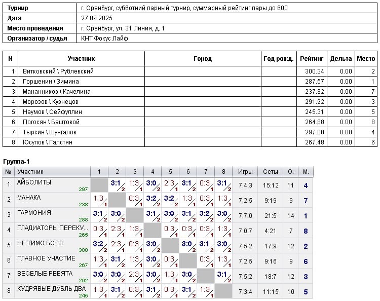В турнире игроков, суммарный рейтинг пары не выше 600 , приняли участие 8 команд :