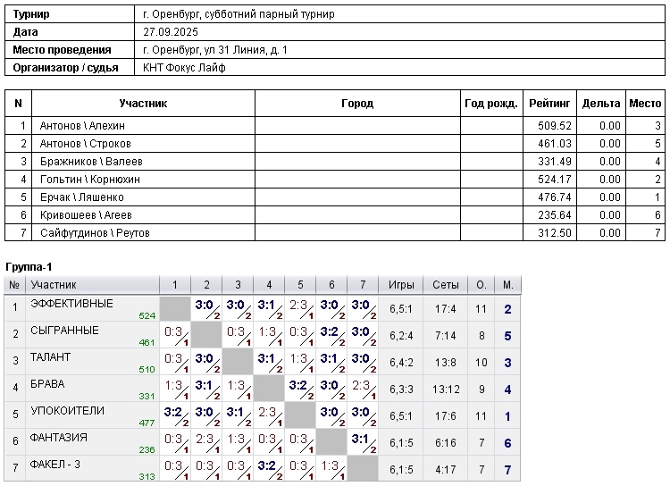 В турнире игроков, суммарный рейтинг пары свыше 600, приняли участие 7 команд:
