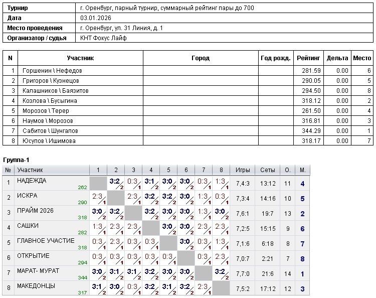 В турнире игроков, суммарный рейтинг пары до 700, приняли участие 8 команд: