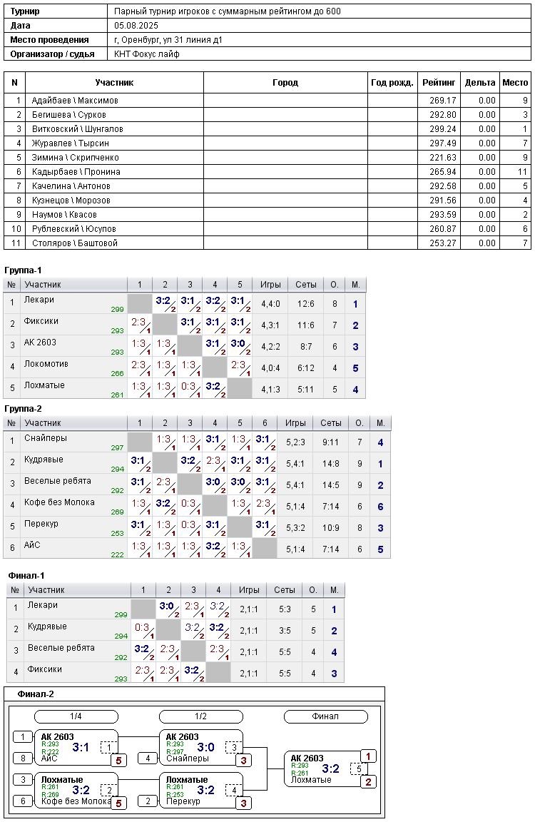Парный турнир “Фокус Лайф” (суммарный рейтинг пары до 600) 5.08.2025