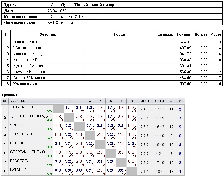 Парный турнир “Фокус Лайф” (суммарный рейтинг пары до 600) 23.09.2025