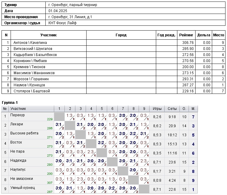Парный турнир “Фокус Лайф” (суммарный рейтинг пары до 600) 1.04.2025