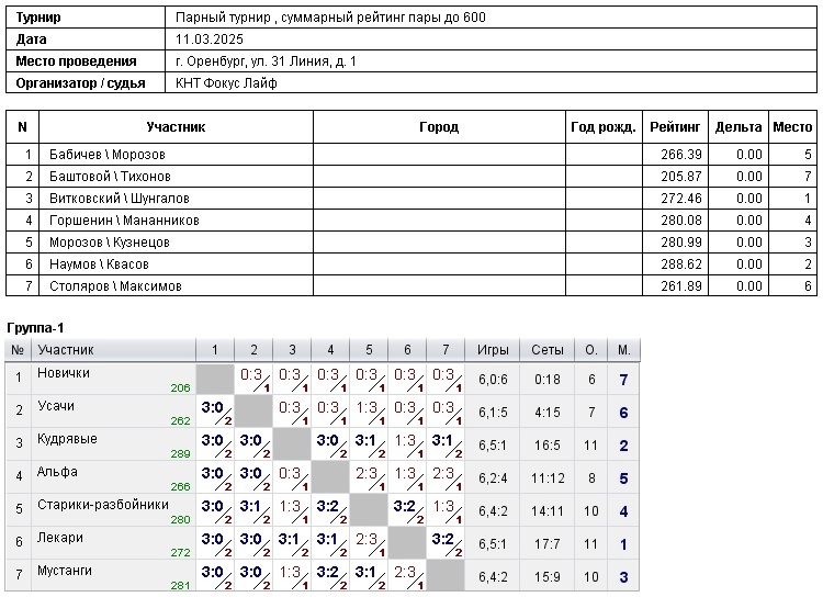 Парный турнир “Фокус Лайф” (суммарный рейтинг пары до 600) 11.03.2025