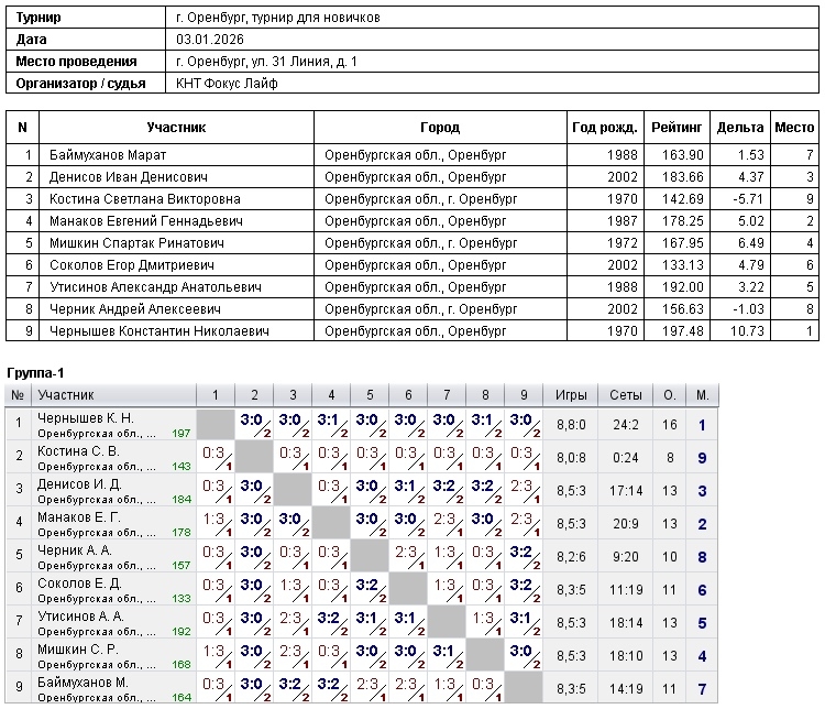 В КНТ Фокус Лайф сегодня прошел турнир для новичков, с рейтингом игроков до 200, в котором приняли участие 9 спортсменов Победителями стали:1 – Чернышев Константин;2 – Манаков Евгений;3 – Денисов Иван Поздравляем победителей!!!