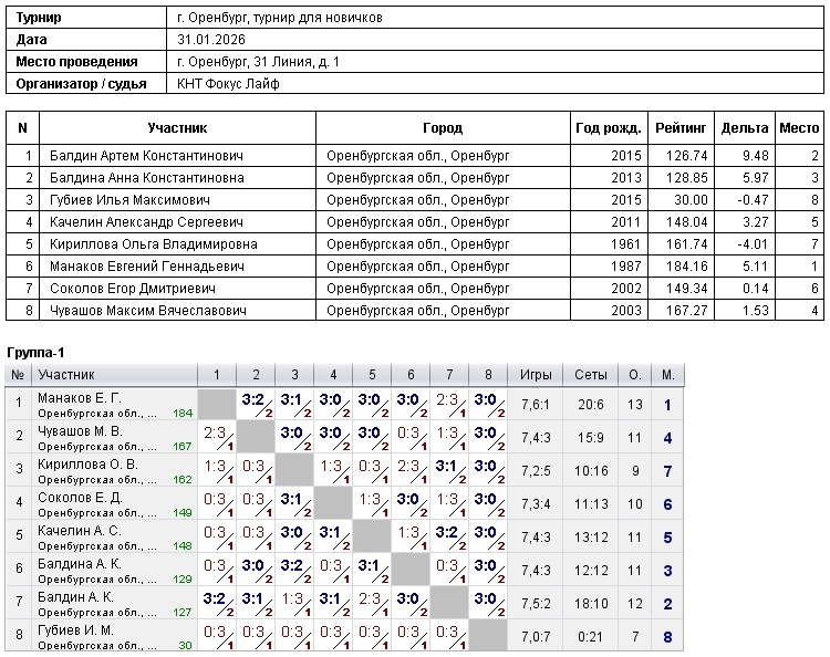 В КНТ Фокус Лайф сегодня прошел турнир для новичков, с рейтингом игроков до 200, в котором приняли участие 8 спортсменов Победителями стали:1 – Манаков Евгений;2 – Балдин Артем;3 – Балдина Анна Поздравляем победителей!!!
