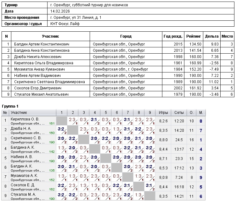В КНТ Фокус Лайф сегодня прошел турнир для новичков, с рейтингом игроков до 200, в котором приняли участие 9 спортсменов Победителями стали:1 – Скрипченко Светлана;2 – Набиев Артем;3 – Балдин Артем Поздравляем победителей!!!