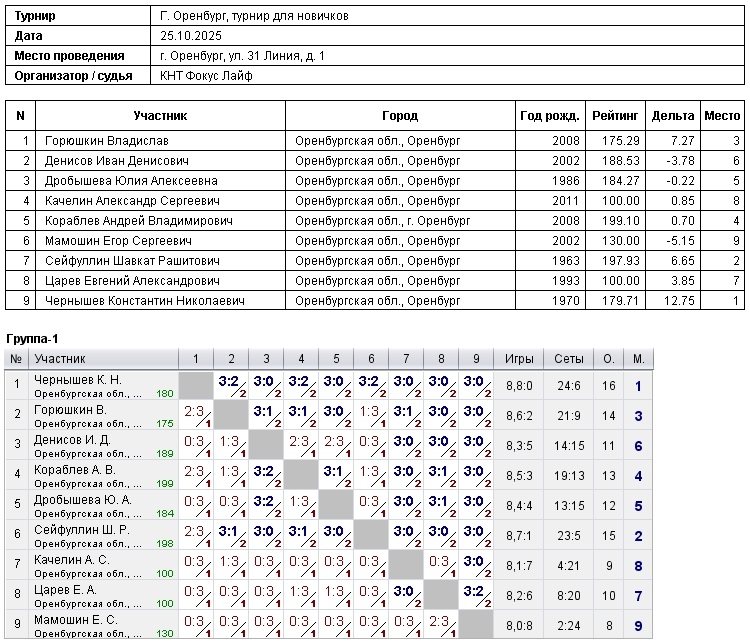 В КНТ Фокус Лайф сегодня прошел турнир для новичков, с рейтингом игроков до 200, в котором приняли участие 9 спортсменов. Победителями стали:1 – Чернышев Константин;2 – Сейфуллин Шавкат;3 – Горюшкин Владислав Поздравляем победителей!!!