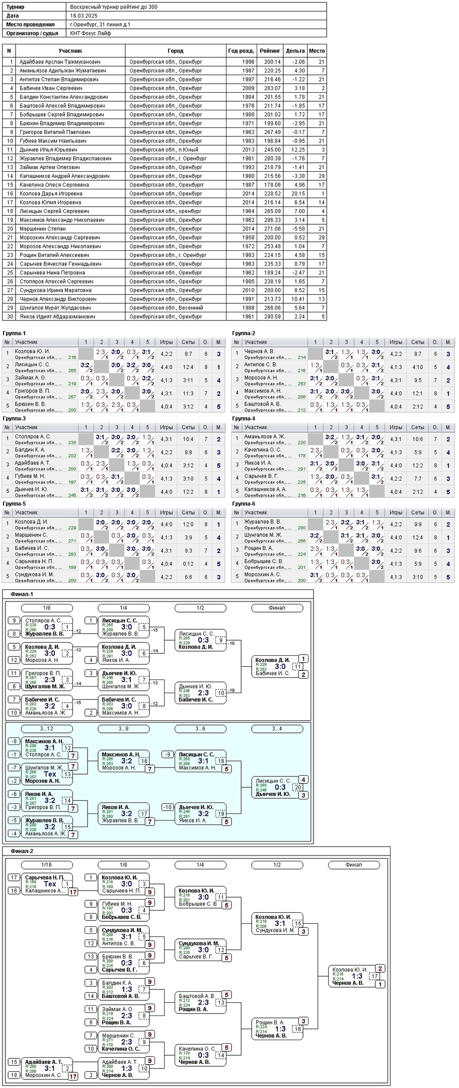 Сегодня в турнире игроков с рейтингом до 300 приняли участие 30 спортсменов.