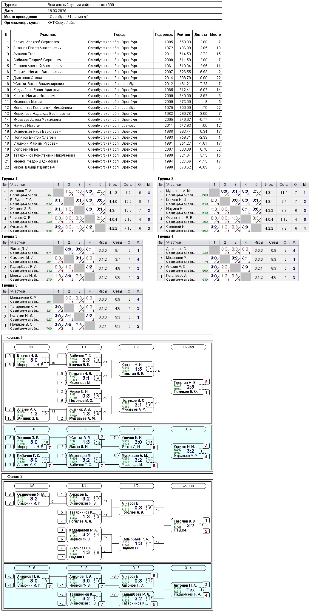 В турнире игроков, рейтинг свыше 300, приняли участие 22 спортсмена.